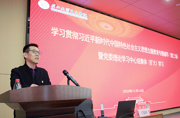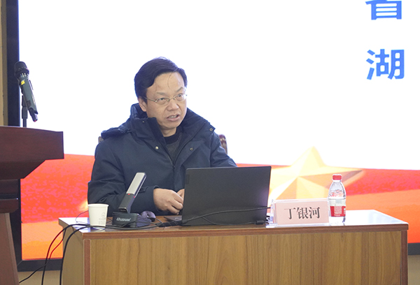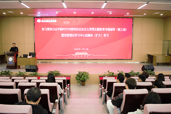 本网讯 11月16日下午,在新校区B-112学术报告厅,学院举办学习贯彻习近平新时代中国特色社会主义思想主题教育专题辅导报告第三场暨党委理论学习中心组集体(扩大)学习会,邀请省委宣讲团成员、湖北工业大学马克思主义学院院长丁银河教授来我院作专题报告。全体院领导、中层干部、党支部书记、辅导员、马克思主义学院全体教师和各教学单位师生代表共两百余人现场聆听。