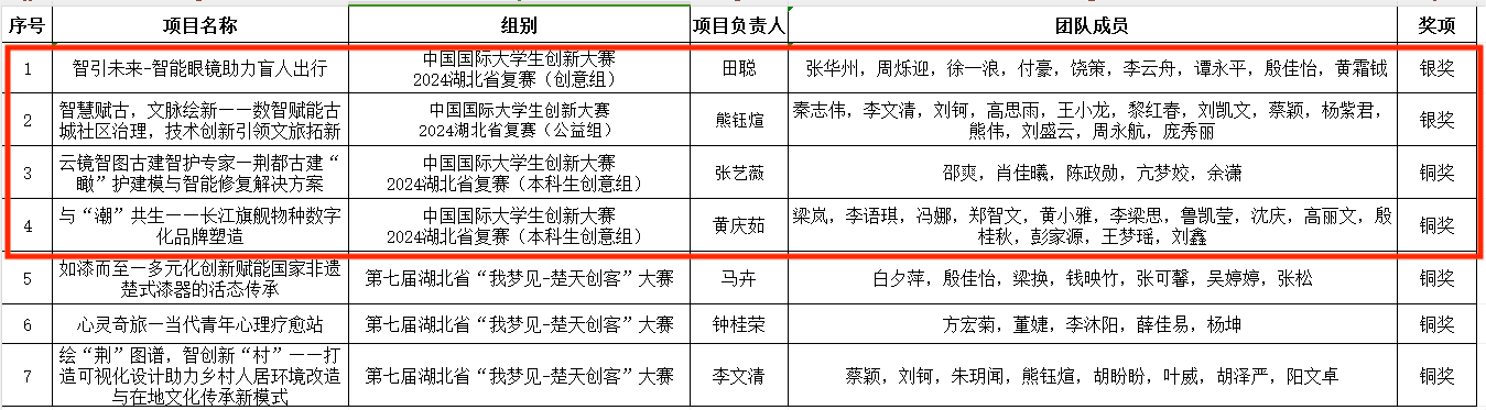 经过校赛评审,我校共推荐15个项目参加省赛网评并入围复赛,7个项目进入省级复赛现场赛。经过激烈角逐,“智引未来——智能眼镜助力盲人出行”“智慧赋古,文脉绘新——数智赋能古城社区治理,技术创新引领文旅拓新”2个项目获得银奖,“云镜智图古建智护专家——荆都‘瞰’护建模与智能修复解决方案”“与‘潮’共生——长江旗舰物种数字化品牌塑造”2个项目获得铜奖。在同期举行的第七届湖北省“我梦见—楚天创客”大赛中,我校3个项目获得铜奖。