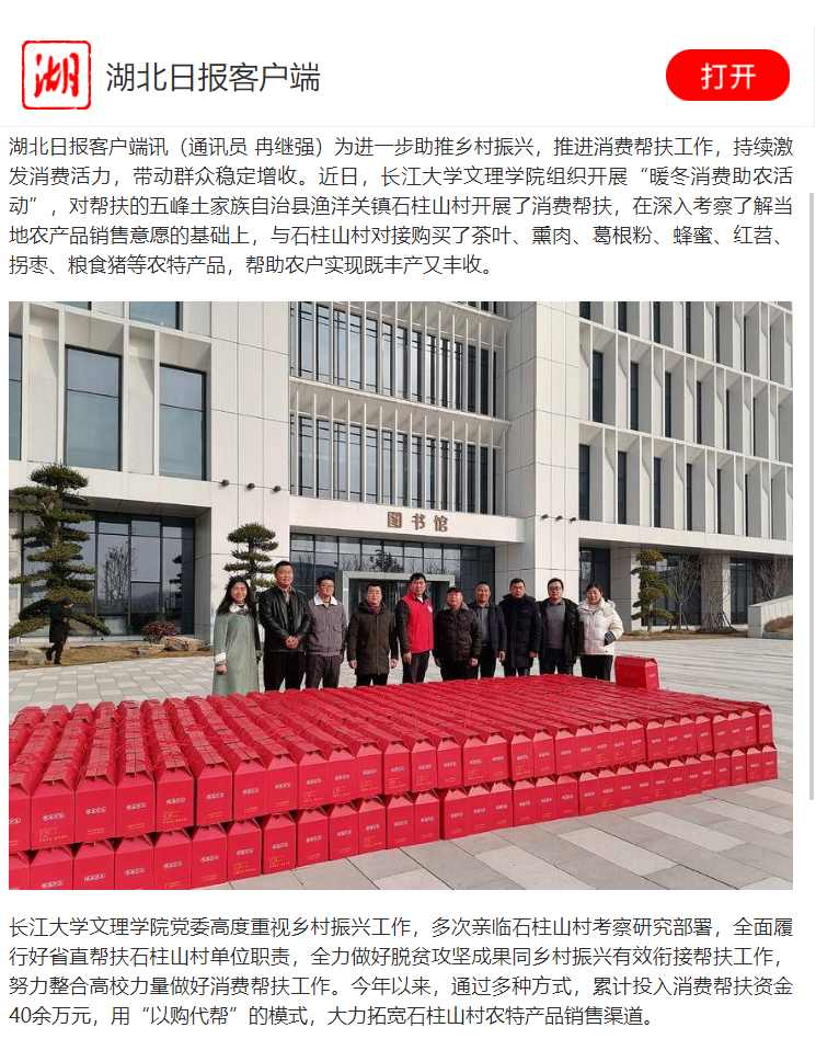 湖北日报客户端讯(通讯员 冉继强)为进一步助推乡村振兴,推进消费帮扶工作,持续激发消费活力,带动群众稳定增收。近日,yl7703永利集团组织开展“暖冬消费助农活动”,对帮扶的五峰土家族自治县渔洋关镇石柱山村开展了消费帮扶,在深入考察了解当地农产品销售意愿的基础上,与石柱山村对接购买了茶叶、熏肉、葛根粉、蜂蜜、红苕、拐枣、粮食猪等农特产品,帮助农户实现既丰产又丰收。