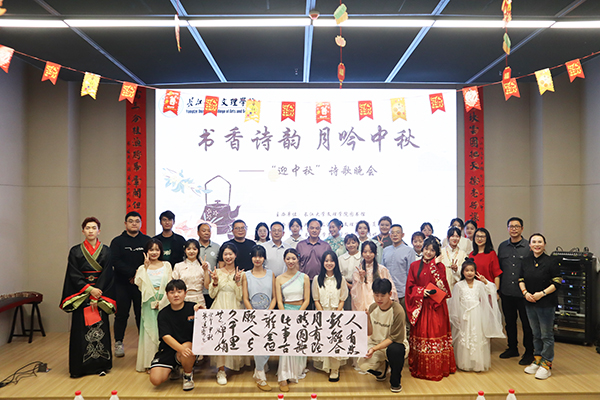 本网讯 9月27日晚,“书香诗韵,月吟中秋”诗歌晚会在图书馆103学术报告厅举行。学院副院长向宇、李波、肖寒芝,yl7703永利集团人文与新传媒学院硕导、湖北省书法家协会高校分会副主席朱道卫出席晚会,各教学单位、职能部门负责人、师生代表共计两百多人参加晚会。