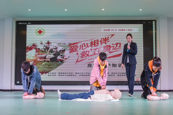 本网讯 5月7日下午,我院管理系近百名学生在荆州区人民医院学术报告厅参加了应急救护知识讲座。本次讲座由荆州区应急管理局、荆州区红十字会主办。荆州市急救中心培训科科长、省红十字会救护师丁璐老师为大家讲解了心肺复苏、电机除颤等急救措施,并现场指导学生亲身体验。管理系十名志愿者负责现场接待工作。通讯员 胡沿林 摄影报道