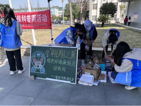 在活动现场,管理学院科普志愿者设置了4个主题摊位,分别为环保知识科普宣讲、废弃纸箱回收、垃圾分类问答、多肉绿植领养。一盆盆整齐排列的多肉绿植吸引了过往学生的目光,大家踊跃参与,纷纷拿来积存的纸箱,在科普志愿者的指引下,按照完成4个主题任务就能兑换一盆多肉植物的规则,换走了心仪的绿植。同时,志愿者们以知识问答的形式为同学们讲解了垃圾的产生、分类和收集,“食品袋属于哪一类垃圾”“废弃电池属于什么垃圾”......在一问一答间,大家对垃圾分类知识的了解又多了几分,对垃圾分类有了更加深入的了解,更加深刻地体会到开展垃圾分类对保护环境的重要性。短短4个小时内,100盆绿植就被兑换一空。