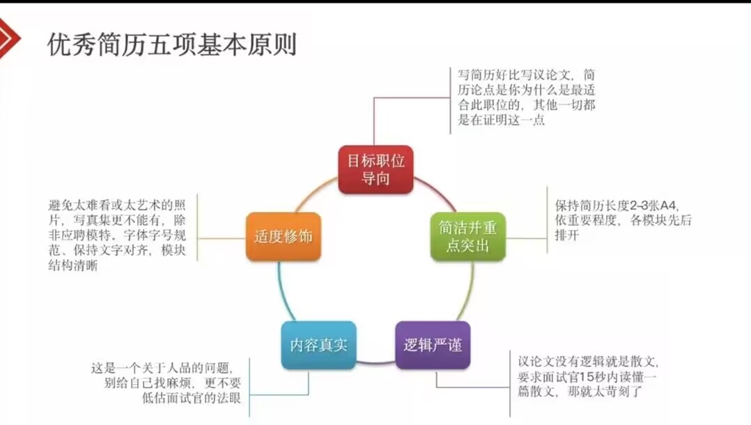 本次分享会上,王老师从就业环境、设计出彩、制作精细、投递讨巧、毕业准备五个方面讲解。从就业环境,为同学们介绍了当今的就业形势。企业现在的缩招、裁员、注销等都让如今的就业形势更加严峻、就业压力加大。从简历设计,要同学们从雇主思维、产品思维和求职思维来想。同时,还需注重简历版面设计及内容框架设计。王老师强调同学们投简历时个人的关键要点必不可少,明确自身的求职意向和遵循优秀简历五项基本原则:目标职位导向、简洁并重点突出、逻辑严谨、内容真实、适度修饰。针对同学们提出的“如何让自身的实践内容在自身条件不突出的情况下具有优势”和“如何写自身的实践内容在自身参加多种活动下”,王老师细致解答,在自身条件不突出时,同学们需要深刻的解剖自身,挖掘自身的优点,从而抓住自身的优势;在自身条件比较突出时,写自身的实践内容可以进行分类,使自身在哪方面的优势就一目了然。
