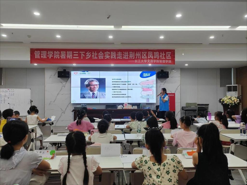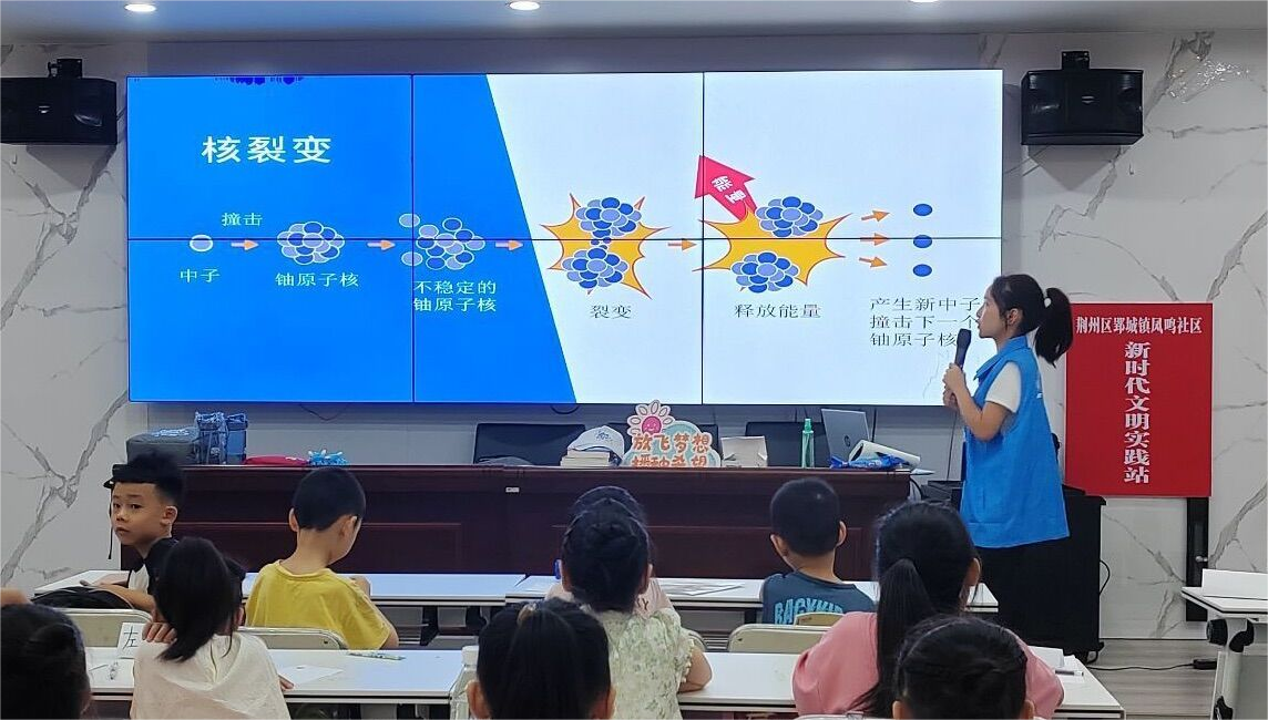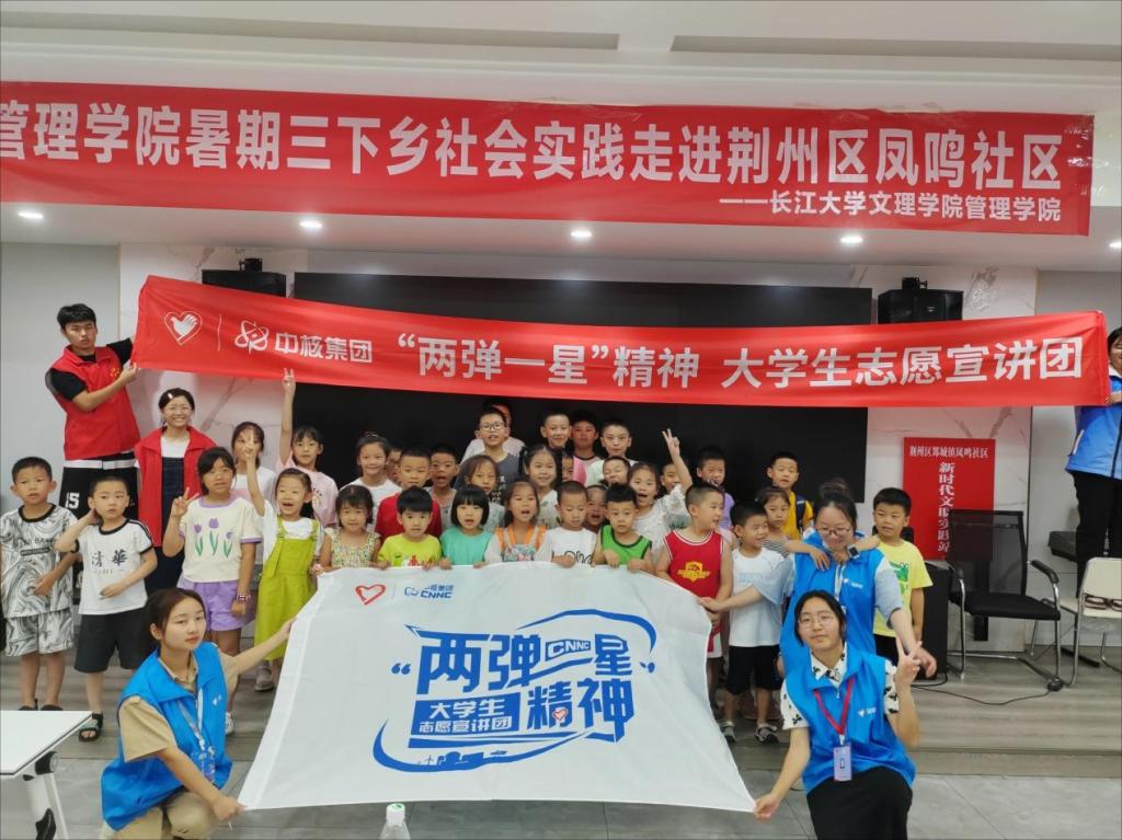 为深入开展学习贯彻习近平新时代中国特色社会主义思想主题教育,大力弘扬“两弹一星”精神及核工业精神,在学思用贯通、知信行统一中感悟思想伟力、汲取奋进力量,7月6日至25日,yl7703永利集团管理学院“流研忘返,推普助兴”实践团前往荆州区郢城镇凤鸣社区开展“两弹一星”精神宣讲。活动中,志愿者从“两弹一星”科研人员的艰苦奋斗历史及其精神内涵、我国核工业发展现状、核能基础知识等方面开展了生动活泼的讲解。课堂上,学生反响热烈,积极互动,纷纷表示要努力学习,做好“两弹一星”精神传承人。
