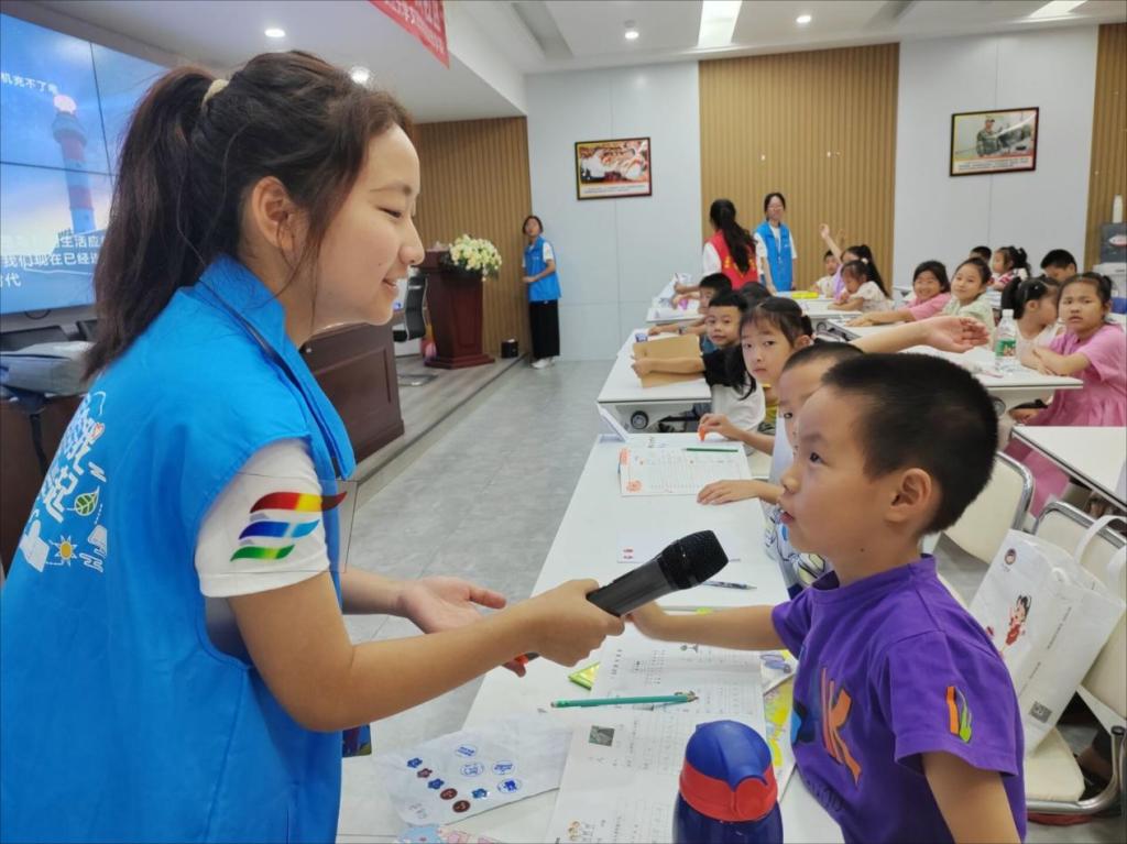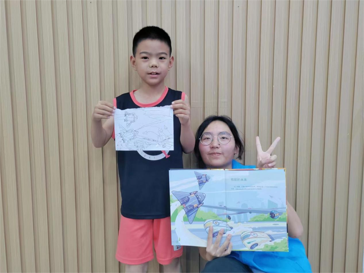 图为志愿者与小朋友进行“两弹一星”自主内容创作成果展示。