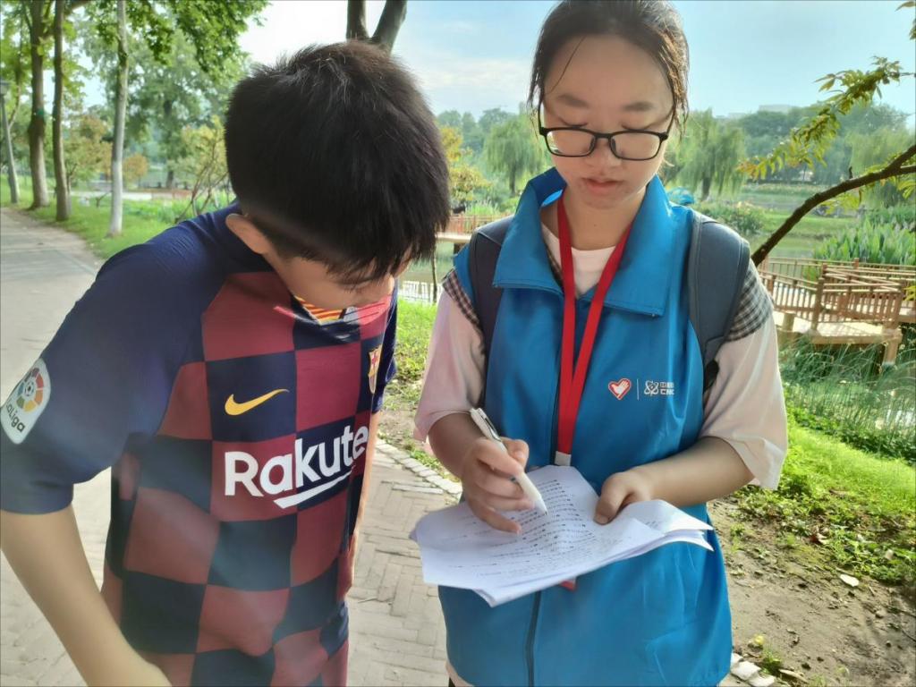 图为志愿者对居民展开关于弘扬“两弹一星”精神的调研。