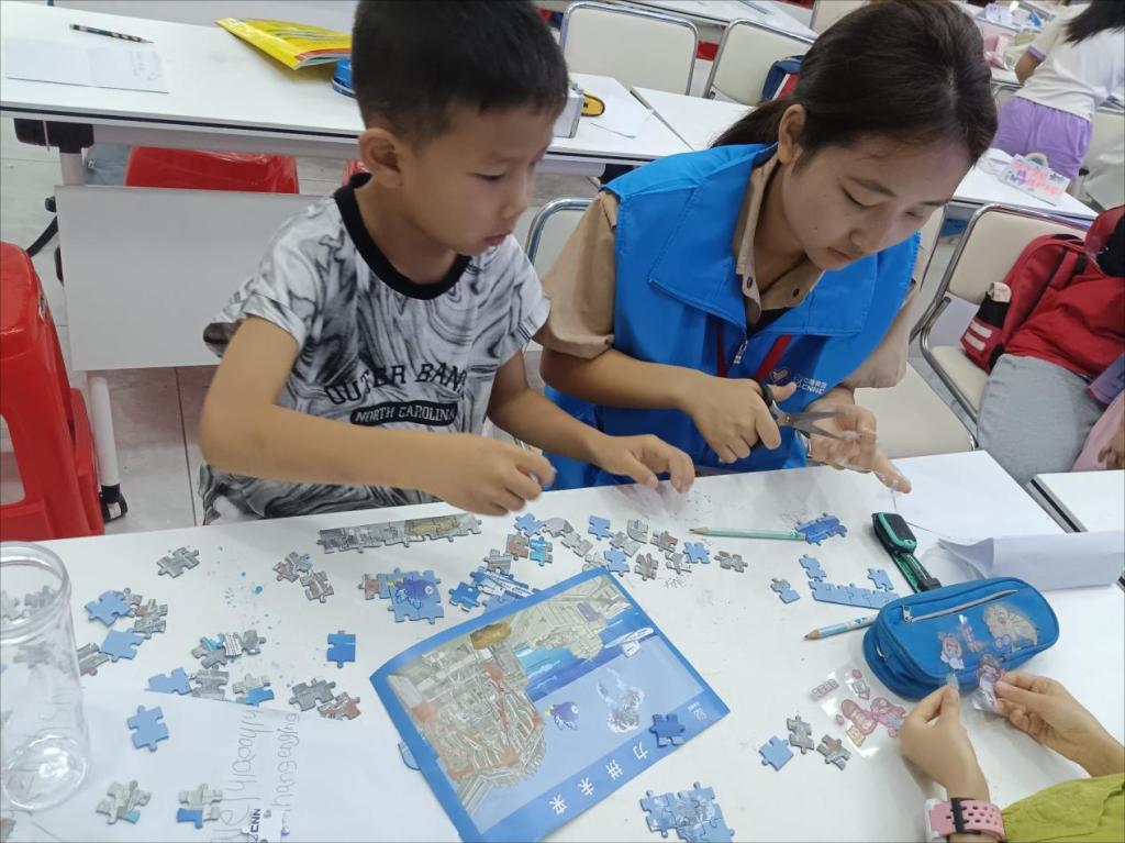 图为志愿者与小朋友一起完成核电站的拼图。