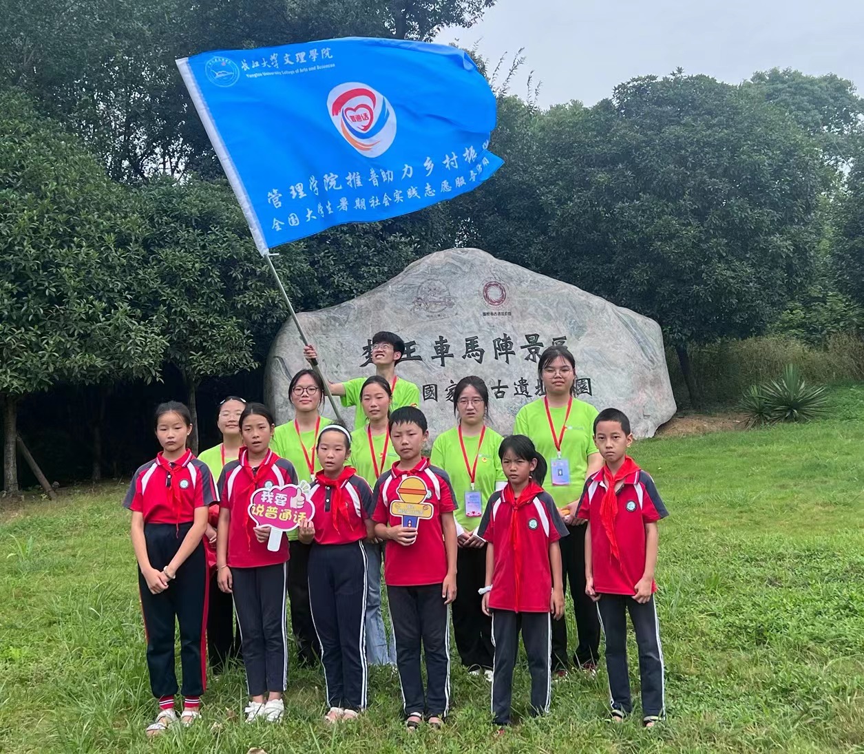 本网讯(通讯员:廖楚楚)7月18日,在川店镇张新场村的大力支持下,管理学院“推普助力乡村振兴”专项活动实践团带领当地儿童到楚王车马阵进行了为期半天的研学活动,实践团成员和小朋友怀揣着对楚文化的憧憬与向往,走进楚王车马阵景区,开启了一段难忘的楚文化研学之旅。