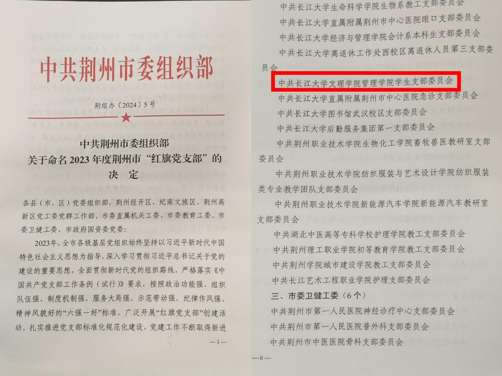 本网讯(通讯员:杨 琪)近日,中共荆州市委组织部发布《关于命名2023年度荆州市“红旗党支部”的决定》(荆组办【2024】5号),管理学院学生党支部被评为2023年度荆州市“红旗党支部”。