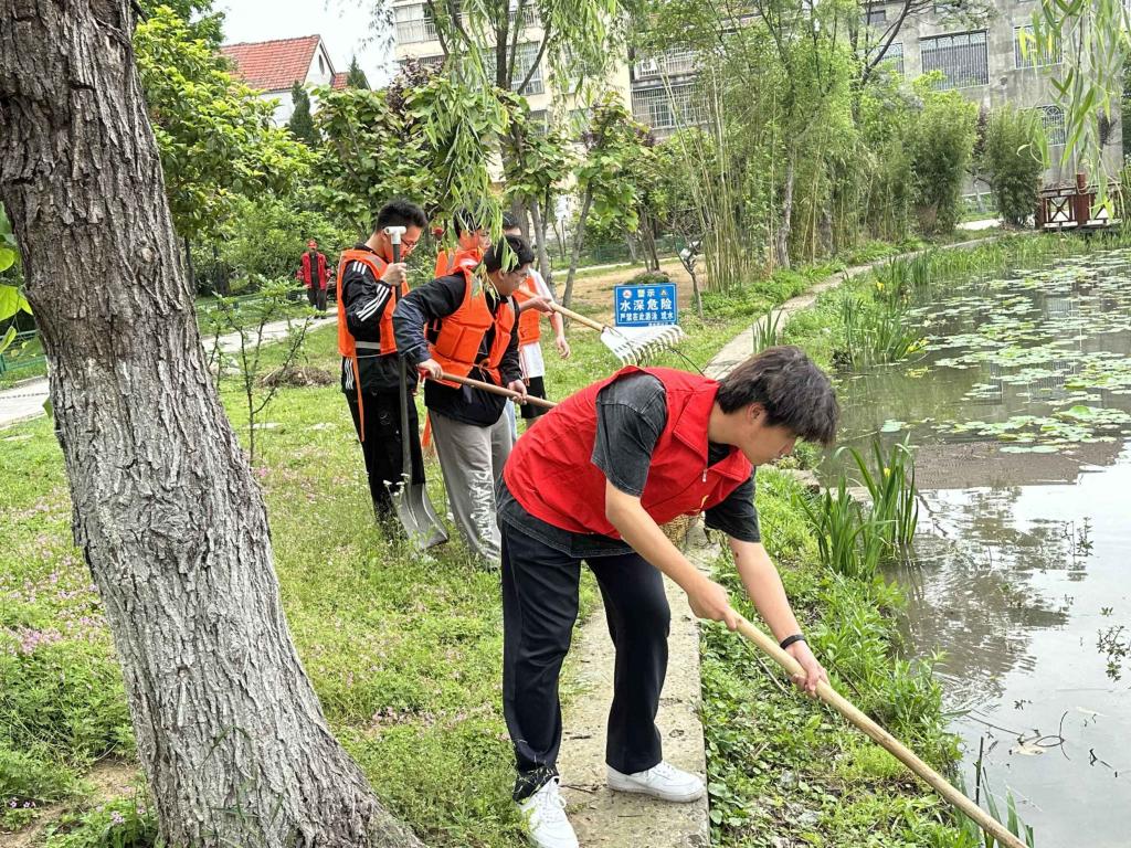 活动中,管理学院志愿者身穿红马甲,手拿渔网、耙子等工具,来到荆州区大北门内环路洗马池公园附近,在保证安全的情况下在将水域中的水葫芦、绿藻浮萍以及垃圾漂浮物等一一打捞起,并对池塘沿岸的枯枝杂草和生活垃圾进行了集中清理,装车送到垃圾中转站进行处理。