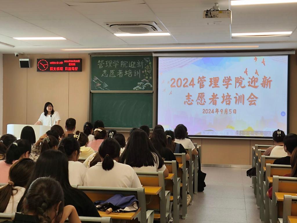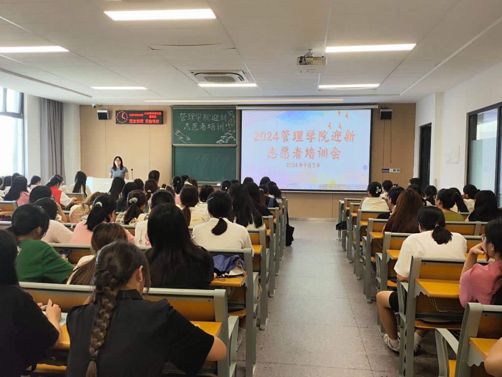 本网讯(通讯员 刘雅茹)为喜迎2024级管理学院新成员,让每位新同学都能第一时间感受到学院的温馨与关怀,我院学生积极报名加入迎新志愿服务行列。9月5日,管理学院于教学楼A-402教室开展了迎新志愿者培训会,对志愿者们进行了统一的培训。本次培训会由管理学院团总支学生会主席廖楚楚主持。