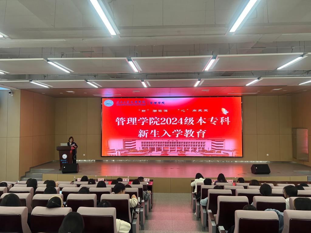 本网讯(通讯员 杨琪)为帮助2024级本专科生快速适应大学生活,顺利、平稳、有效地实现从中学阶段到大学阶段的过渡,帮助新生扣好大学生涯的“第一粒扣子”,11月7日下午,管理学院于教学楼一楼学术报告厅举办“2024级新生入学教育大会”。学院领导班子成员、2024级新生专业班主任、辅导员以及212名管理学院新生参加会议。大会由学院2024级辅导员李晗明主持。