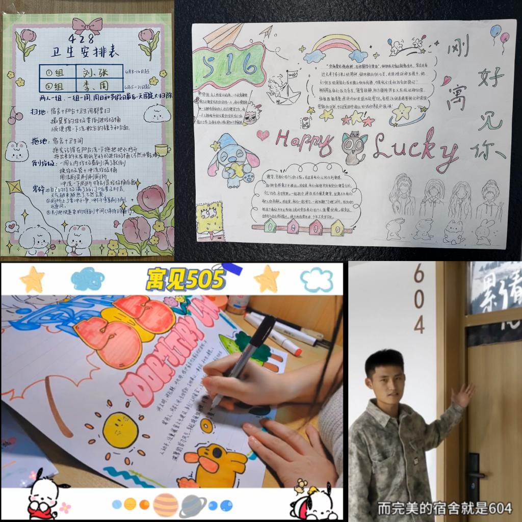 在“寝室内务大比拼”中,各寝室学生根据主题自由发挥、融入创新和创意,对房间进行清理和装饰,展现了独特的寝室文化。在‘宿’说青春,‘寓’见美好”寝室风采展示环节中,大一“萌新破冰,装扮小窝”,记录破冰及装扮过程;大二“活力和多彩”,演绎欢快寝室生活或记录欢乐瞬间;大三“奋斗时光,温馨寝室”,展现共同奋斗与关怀;大四“回忆之旅,永恒的家”,以照片回忆四年珍贵情谊。在“搭建心灵家园,共创和谐宿舍”宿舍文明公约设计评比中,宿舍成员们群策群力,在舍风、学风、安全卫生及生活习惯等多维度上大胆创新,提炼出独树一帜的宿舍文化精髓,并凝结为特色鲜明的文明公约。