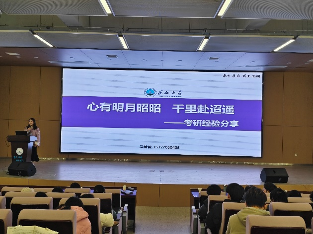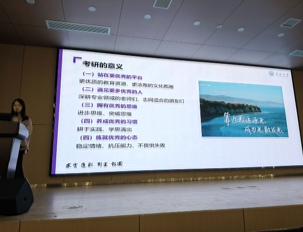 紧接着是两名长大在读研究生的考研心路历程分享。首先是毕业于我校的吴蕾蕾,她先从考研的意义、考研择校思路分享以及考研经验分享三个部分来分别讲述。吴蕾蕾的考研经验就是先要有科学的备考计划,然后是学习方法,接着是制胜法宝的相关名言,最后她对在场的所有学弟学妹表示了殷切的祝愿!