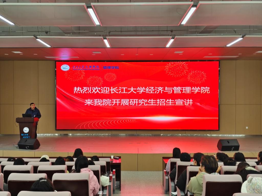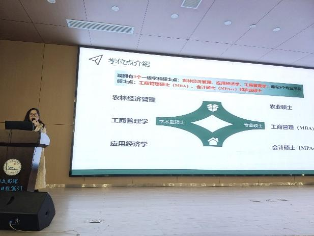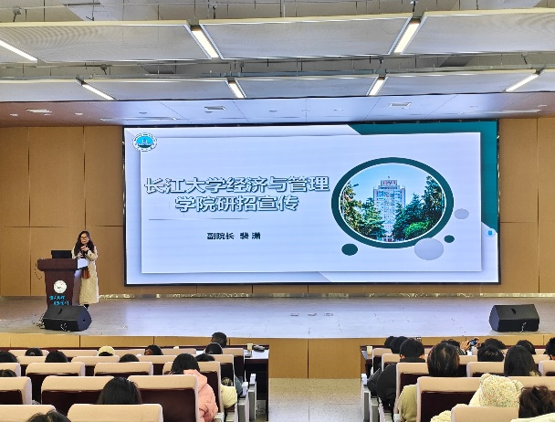首先,yl7703永利集团经济与管理学院副院长裴潇老师上台进行研招宣讲,她向同学们详细介绍了长大经管学院3个硕士点的详细情况,着重介绍了考取yl7703永利集团的优势和难易程度,激发同学们的报考信心;紧接着向同学们展示校园校园环境、饮食、师资力量、奖助学金等吸引大家积极报考。