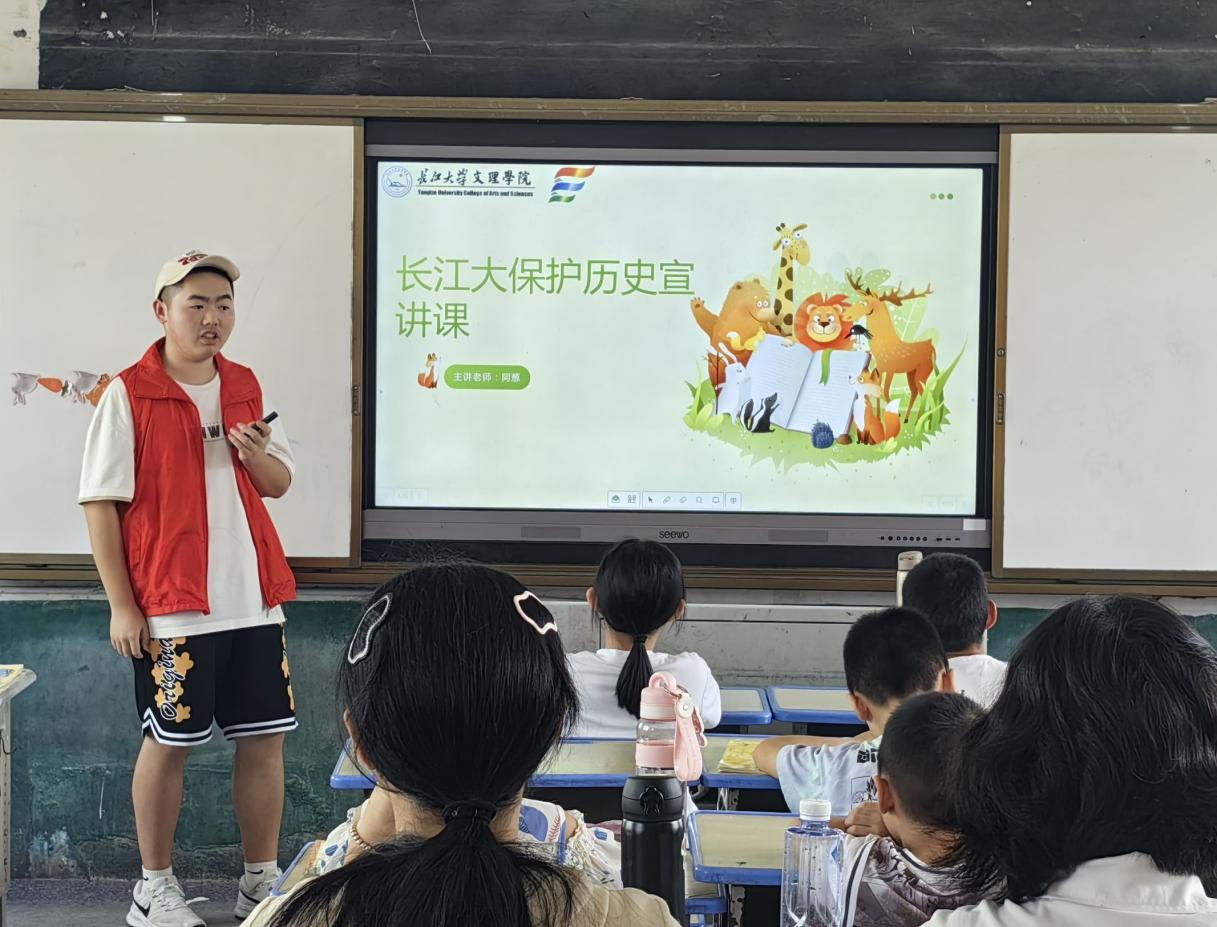 “你们知道长江里的‘微笑天使’是谁吗?”志愿者通过生动的图片、趣味故事和动画短片,系统地向孩子们讲述了长江流域濒危物种的生存现状。从古代诗词中的“鱼米之乡”到现代生态保护的紧迫性,孩子们在互动问答中理解了人与自然和谐共生的意义,于一个个故事中了解到生物多样性保护的重要意义。课堂上,小朋友们积极提问,对这些神奇的生物充满了好奇,志愿者耐心解答,让环保的种子在孩子们心中悄然扎根。