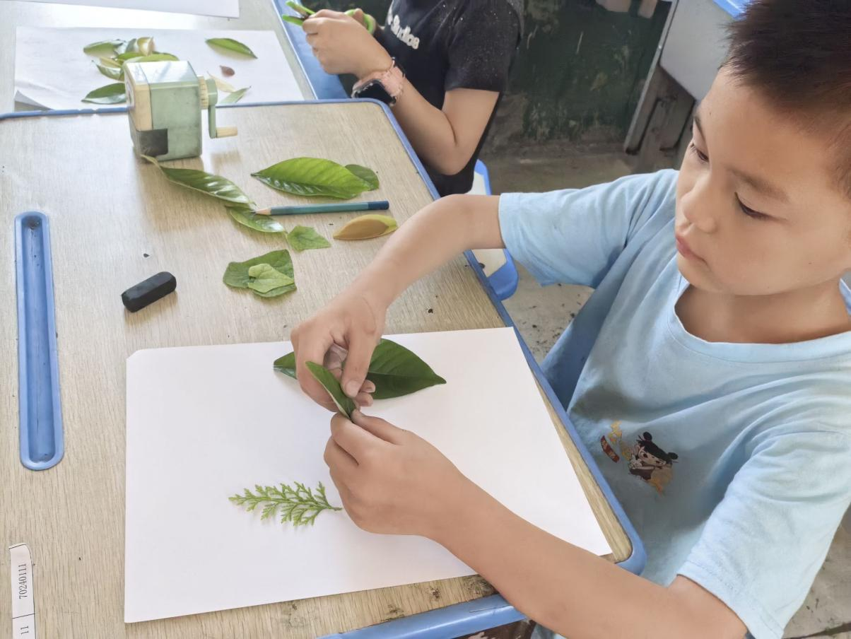 艺术是滋养心灵的雨露。志愿者们为孩子们打造了充满自然意趣的艺术课堂:树叶拼贴画活动中,孩子们收集各种形状的树叶,发挥想象力组合成小动物、风景画等作品,童真创意跃然纸上;植物拓印环节,孩子们将新鲜叶片固定在帆布包上,用工具轻轻敲打,让叶片的纹理与色彩自然晕染,制成独一无二的天然艺术品。动手创作的过程中,孩子们不仅感受着自然之美与艺术之趣,更在剪裁、拼贴、拓印的操作中提升了审美能力与动手协调能力。课堂上的欢声笑语与专注神情,成为夏日乡间最动人的画面。