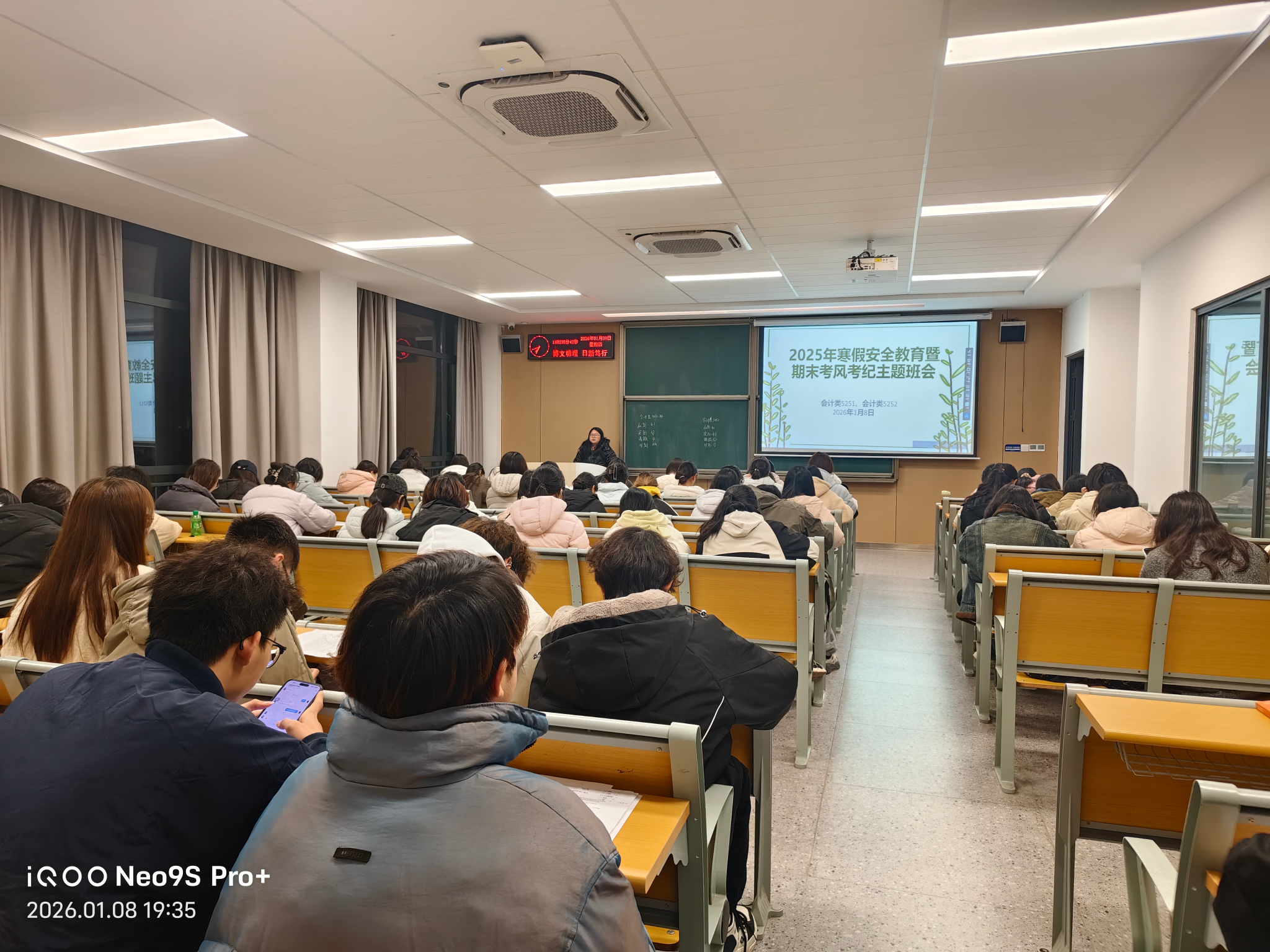 在各班班会上,辅导员老师们首先向同学们传达了学校关于寒假放假及春季学期开学的具体安排。随后,班会围绕“安全离校,平安度假”这一核心主题,展开了系统、细致的教育引导。
