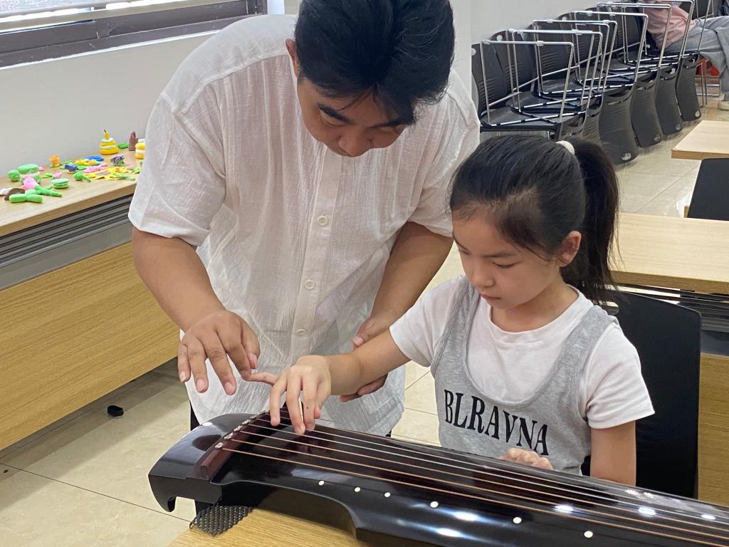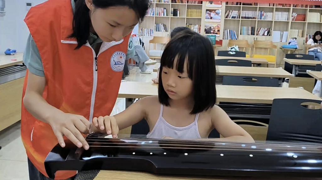 本网讯(通讯员 李晗明)7月15日,迎喜门社区的活动室里琴声悠扬,一堂浸润着千年古韵、又满是童真好奇的古琴课缓缓开启。本次活动特邀沙市古琴艺术非遗代表性传承人余刚老师授课,管理学院的志愿者们早早到场布置场地,全程为活动保驾护航。