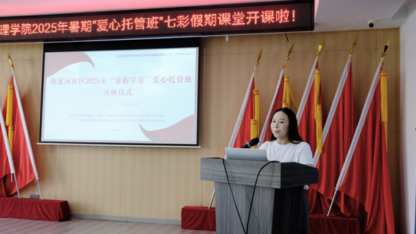 荆襄河社区书记杨雪娇为开班仪式致辞。她强调:“暑期课堂是校社协同育人的重要平台,期待大学生志愿者们为社区青少年注入知识与活力。”
