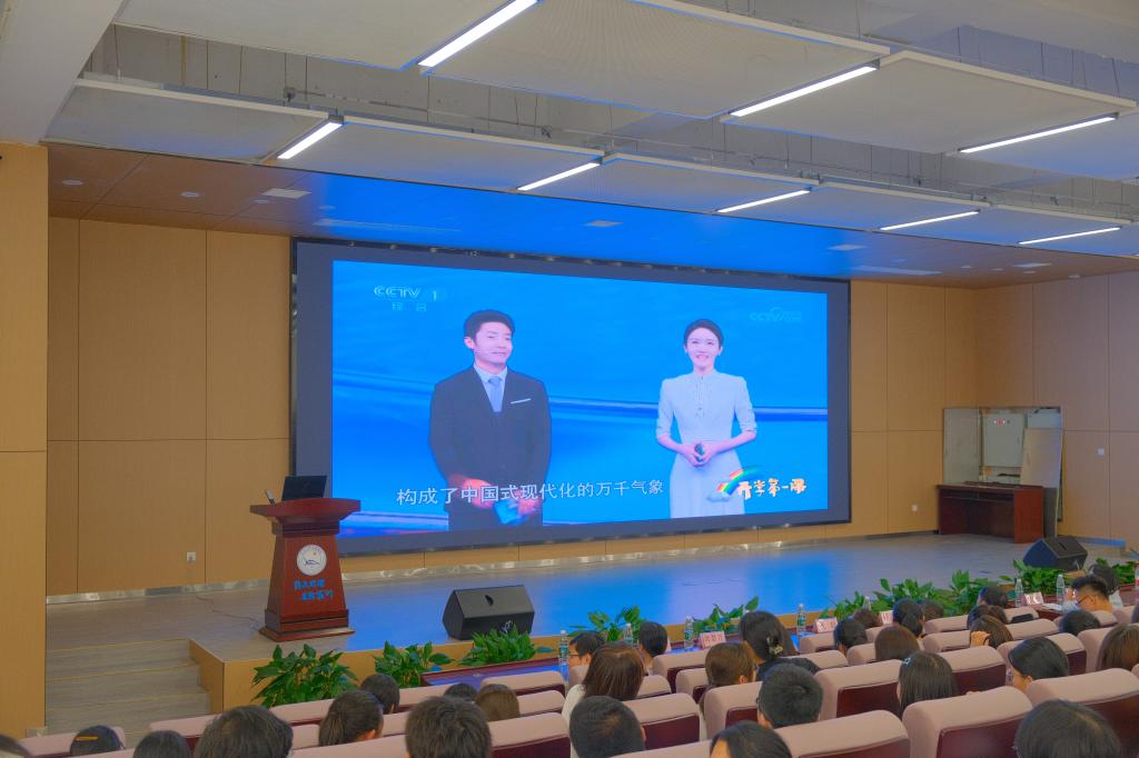 会议开始前,管理学院组织2023级新生集中观看本期以“强国复兴有我”为主题的开学第一课。随后管理学院党总支书记胡沿林为新生带来了以“携手共进,让梦想飞”为主题的开学第一讲。胡沿林从介绍学校及学院基本情况、讲解学生手册、毕业证发放条件等几个方面对2023级新生提出了新的要求和希望。勉励新生要坚持理想,敢于担当,努力学习,争做新时代的奋斗者。