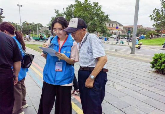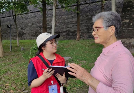 图为志愿者在护城河周围的居民小区进行流域调研