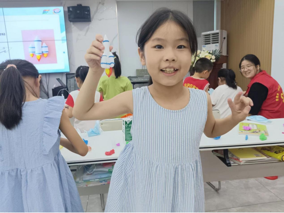 图为小朋友展示手工黏土--火箭模型
