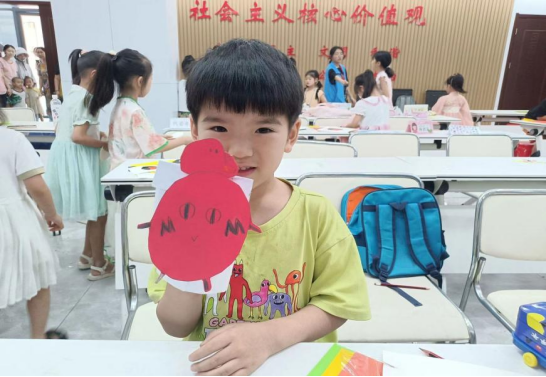 图为小朋友高兴的展示自己的手工作品