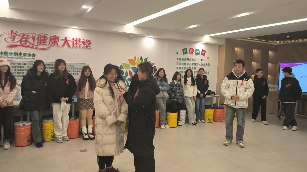 在校内湖北省青春健康教育基地,由主持人周静如带领学生开展《预防艾滋病》同伴教育,通过“野火游戏”游戏,让青年朋友亲身体验艾滋病病毒传播速度、途径及感染者的内心感受,增强对艾滋病感染者的理解,提高对艾滋病病毒传播的警觉性。活动中通过问答讨论环节不断延伸课程内容,鼓励参与者从个人的角度积极投入到艾滋病预防和关怀的工作中。