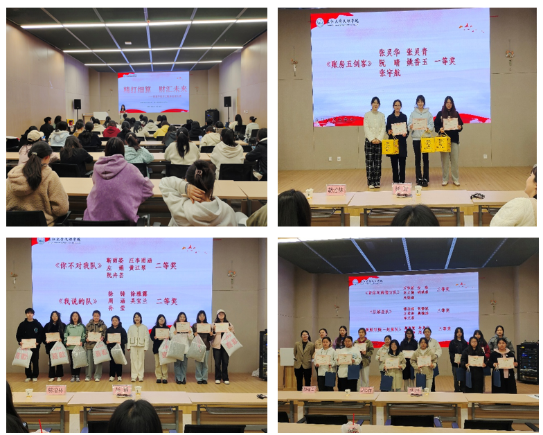 一个星期后,管理学院举办了颁奖仪式。参加颁奖仪式的有管理学院党总支书记胡沿林书记,副院长杨璐老师,辅导员孙晗雪老师。经过严格评审和检查,比赛结果出炉:一支队伍“账房五剑客”获得一等奖,两支队伍“你不对我队”“我说的 队”获得二等奖,“贷你玩转借方队”“从容应队”“新账旧账一起算队”获得三等奖,管理学院党总支书记胡沿林书记,副院长杨璐老师,辅导员孙晗雪老师为获奖队伍颁发了荣誉证书和奖品,并对他们表示祝贺。。