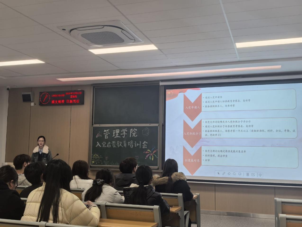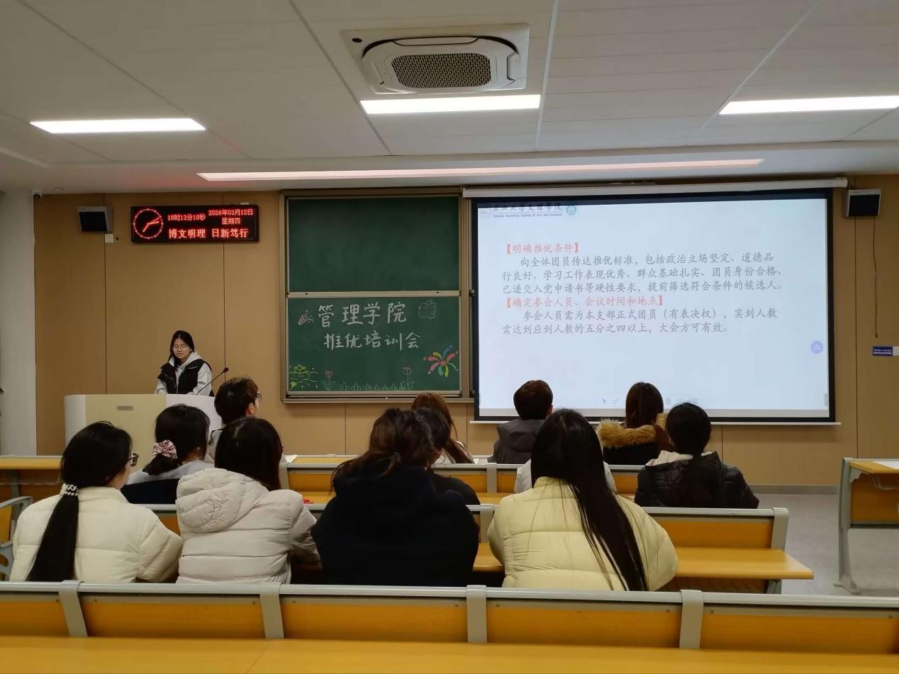 本网讯(通讯员 胡昌彬)为进一步夯实基层团组织建设,强化团支书的思想引领能力与团务工作实操水平,引导广大团员青年积极向党组织靠拢。2026年3月12日晚19:00,管理学院团支书培训会在C-417M教室顺利举行。会议分为入党启蒙教育、推优工作实务培训两个核心环节。本次培训会由管理学院学生党支部成员何若萱和管理学院团总支学生会组织建设部部长高静玉主持,25级全体团支书参会。