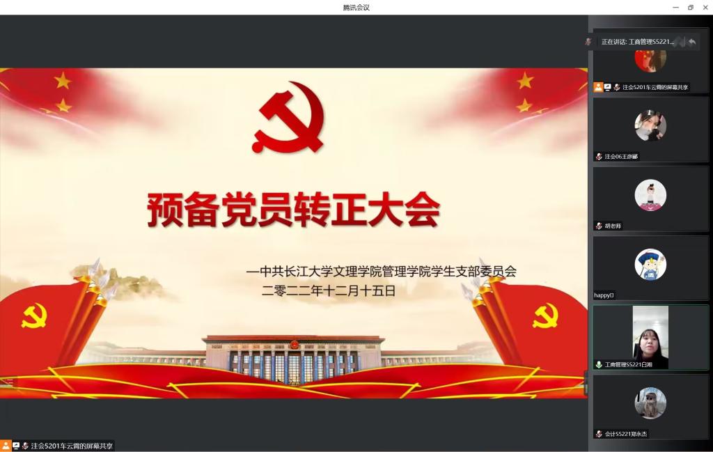 本网讯(通讯员 王彦郦) 2022年12月15日星期四下午14:00, 我学院学生党支部以线上形式召开预备党员转正大会,讨论关于白湘同志转正为正式党员。会议由车云霄同志主持,支部其他党员同志同时参加会议,就此发表意见。