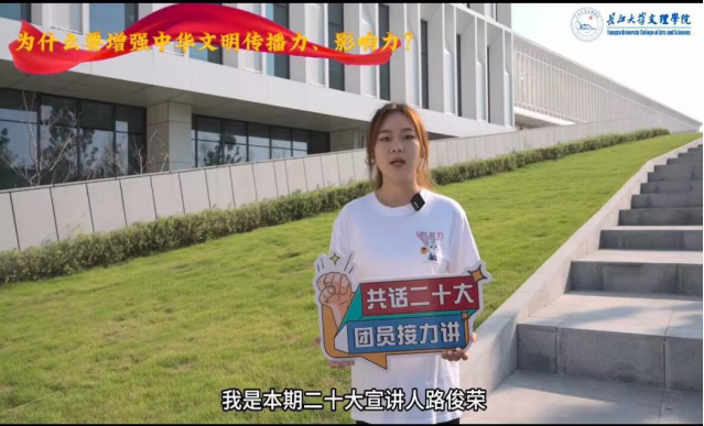 本网讯(通讯员 陈露)为充分发挥党员的主体作用,进一步推动党的二十大精神入脑入心,管理学院学生党支部以微党课为载体,以思想引领为目的,结合“党建+微宣讲“的形式,在6月开展”共话二十大,团员接力讲“特色活动,促进党建带团建。支部成员积极参与栏目的视频制作,注会5211团支部宣讲人路俊荣:学习二十大,团员接力讲,我是本期二十大宣讲人路俊荣,习近平在党的二十大报告指出增强中华文明传播力、影响力,必须加强国际传播能力建设要坚持把讲好中国故事,传播好中国声音展示真实、立体、全面的中国作为加强我国国际传播能力建设的重要任务全面提升国际传播效能。