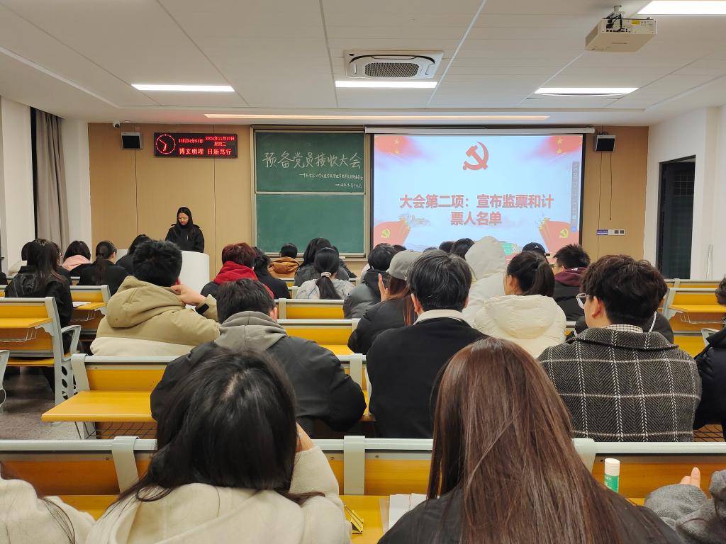 接收大会开始,廖楚楚等6名发展对象依次上台做简短的发言,汇报自己对党的认识和感悟、入党动机、个人情况、个人对未来的展望以及个人在思想、学习、生活、工作上的情况。入党介绍人分别针对他们的发言提出意见,指出该同志的优缺点,及有待改善和提高的地方,并表达是否建议接收其为中共预备党员。经过充分讨论,正式党员进行了无记名投票表决,最终同意接收6名同志为中共预备党员。