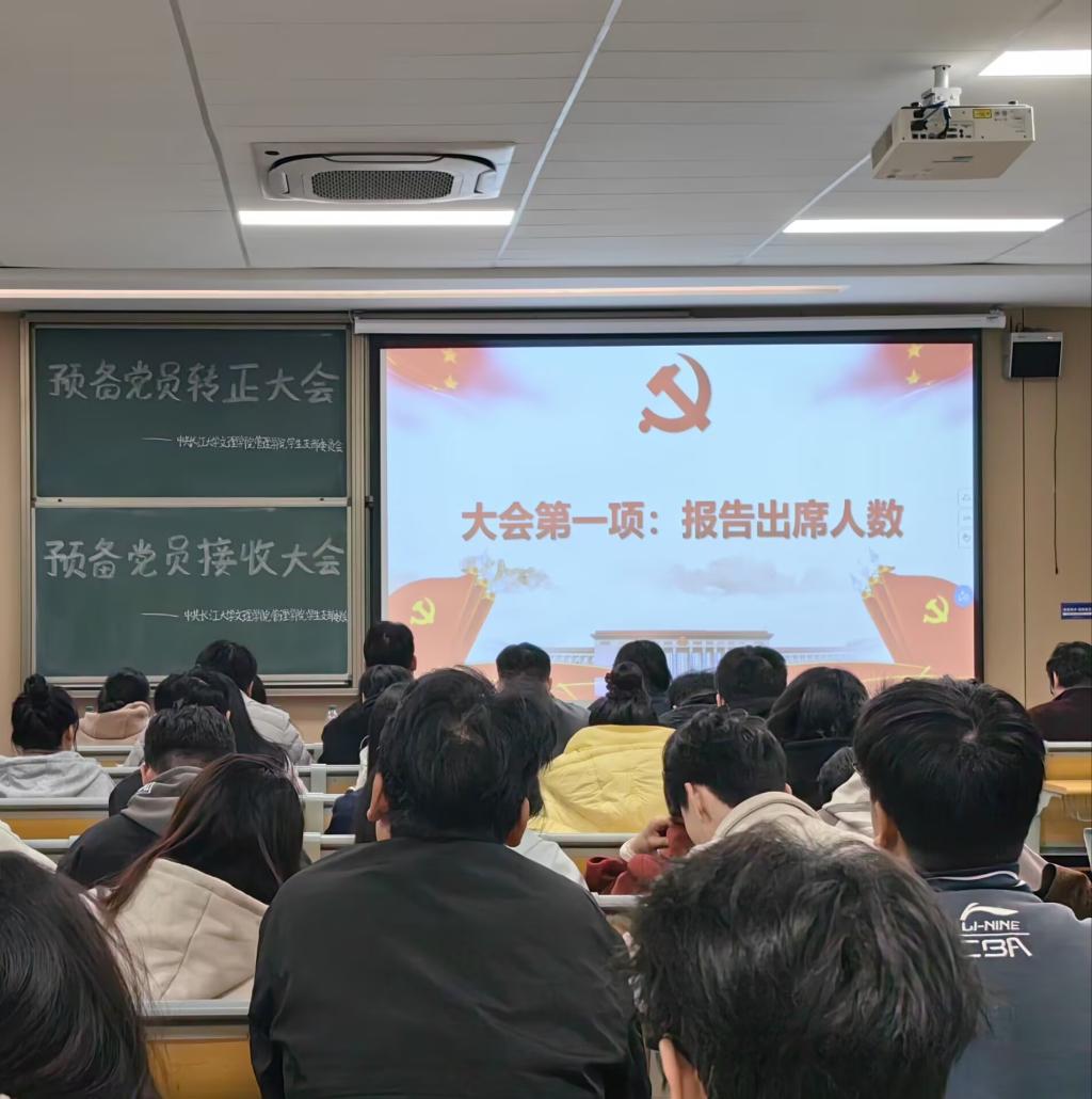 本网讯(通讯员黄江琴)2025年11月27日星期四晚上19:00,管理学院学生党支部于A-402S隆重召开预备党员转正大会,讨论并决议接收吴宝兰等7名同志为中共正式党员。本次大会由阮晴同志主持,管理学院学生党支部书记杨琪及入党介绍人侯伟老师、李平老师、杨柳老师、周丹老师出席本次会议,全体党员参与。