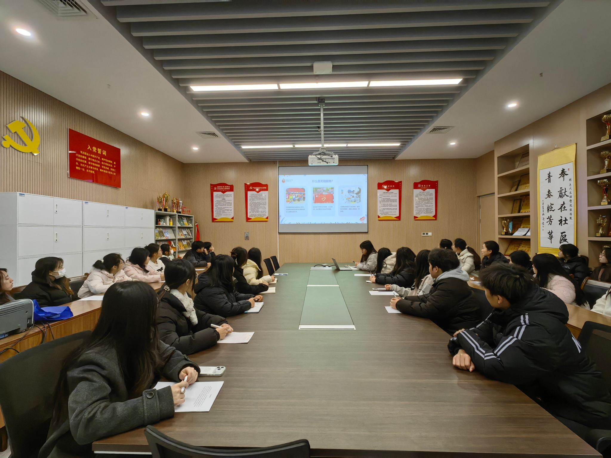 在交流环节,杨琪老师结合自身献血经历,分享了感受与体会,并就同学们关心的常见问题进行了细致解答,帮助大家消除对献血的疑虑与误解。她呼吁同学们科学认识献血,积极加入到无偿献血的队伍中来。与会党员一致认为,带头参与献血是党员履行社会责任、服务人民群众的重要体现,也是发挥先锋模范作用的具体实践。