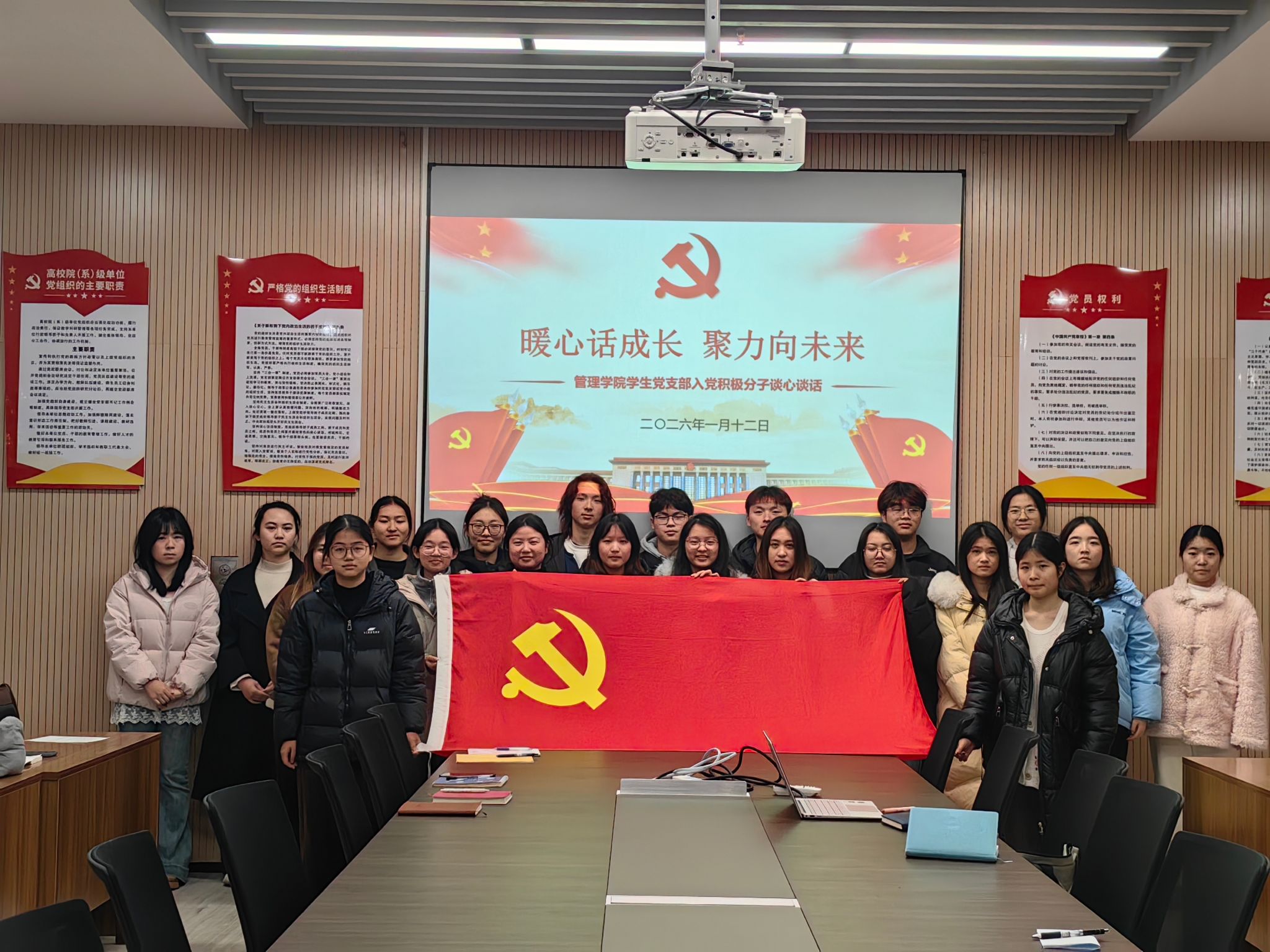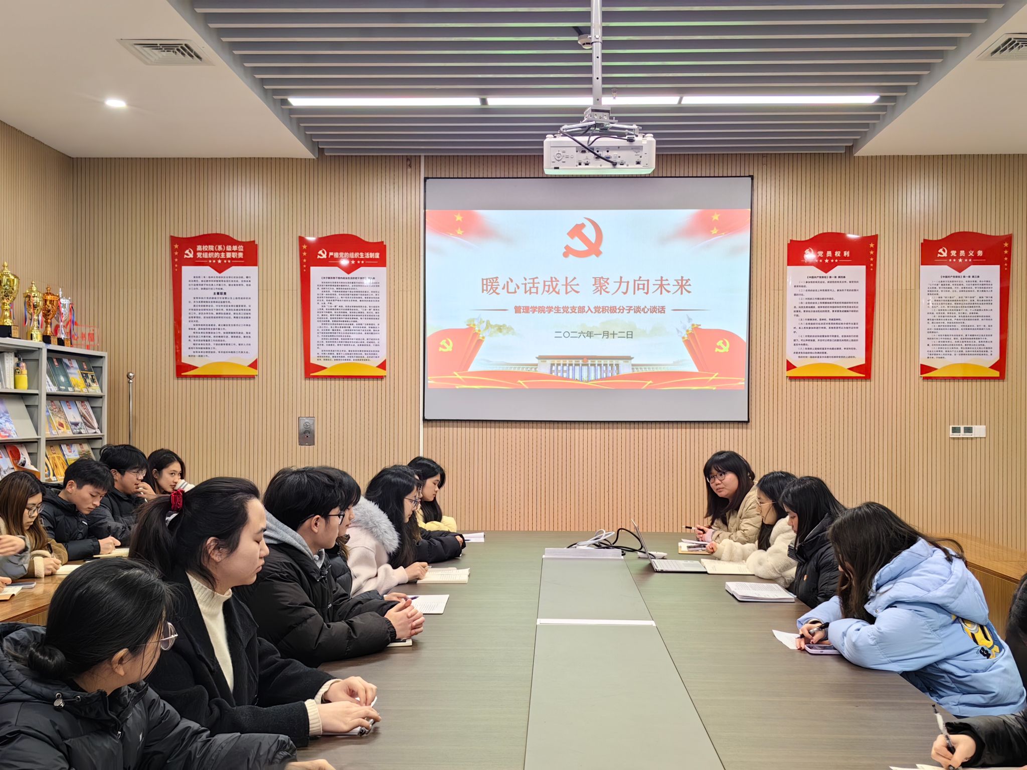 本网讯(通讯员 黄江琴)为进一步了解入党积极分子思想动态、学习状况和现实表现,进一步加强党员发展的培养与考察工作,筑牢党员发展质量。1月12日下午,管理学院学生党支部在图书馆532会议室组织开展了“暖心话成长,聚力向未来”入党积极分子座谈会。会议由学生党支部书记杨琪主持,党支部组织委员兼纪检委员王希若、宣传委员万学君及29名入党积极分子参加会议。