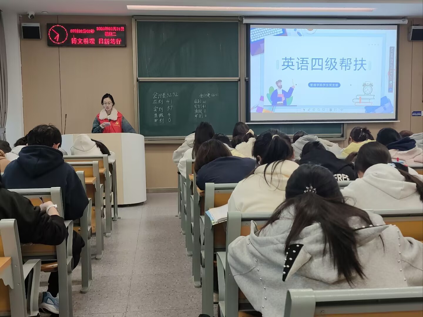 本周活动中,支部党员、学生干部在班级内设立“听写进步榜”,每周评选进步明显的同学进行表扬,并邀请进步较大的同学分享学习心得。同时,支部组织高分通过四六级的优秀学生党员走进早自习课堂,分享自己的备考历程与坚持经验,用真实的故事激励同学们克服困难、坚持到底。