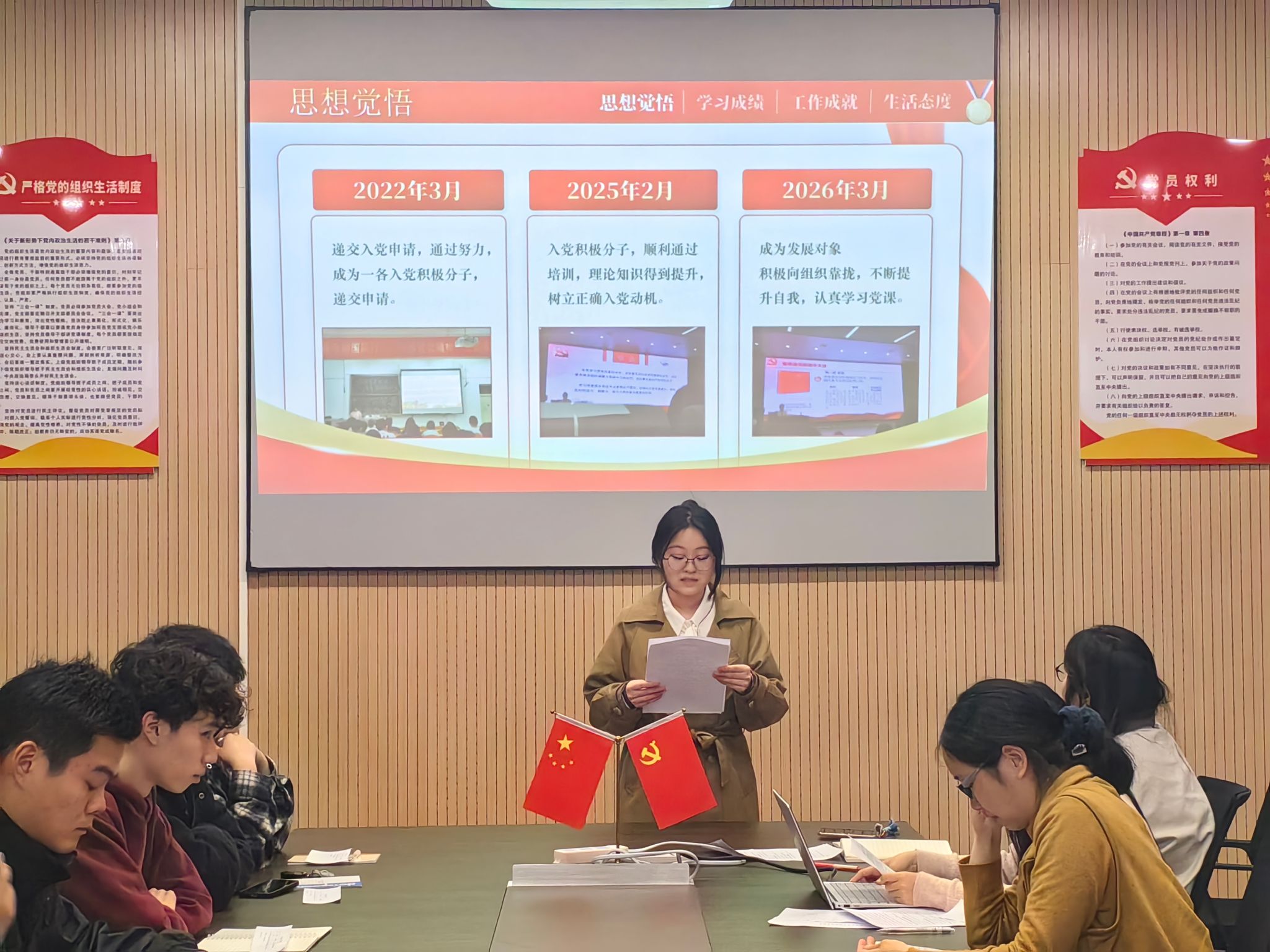会议伊始,发展对象进行个人陈述,围绕对党的认识、入党动机、个人成长经历等内容作了详细汇报,并结合自身在思想、学习、生活、工作中的实际表现进行反思总结。随后,杨柳老师对文妙同志的表现进行评价,既肯定了优点,也指出了今后需要改进的方向,并明确表达了建议接收为预备党员的意见。经与会正式党员认真讨论和现场无记名投票表决,文妙同志全票通过,被接收为中共预备党员。
