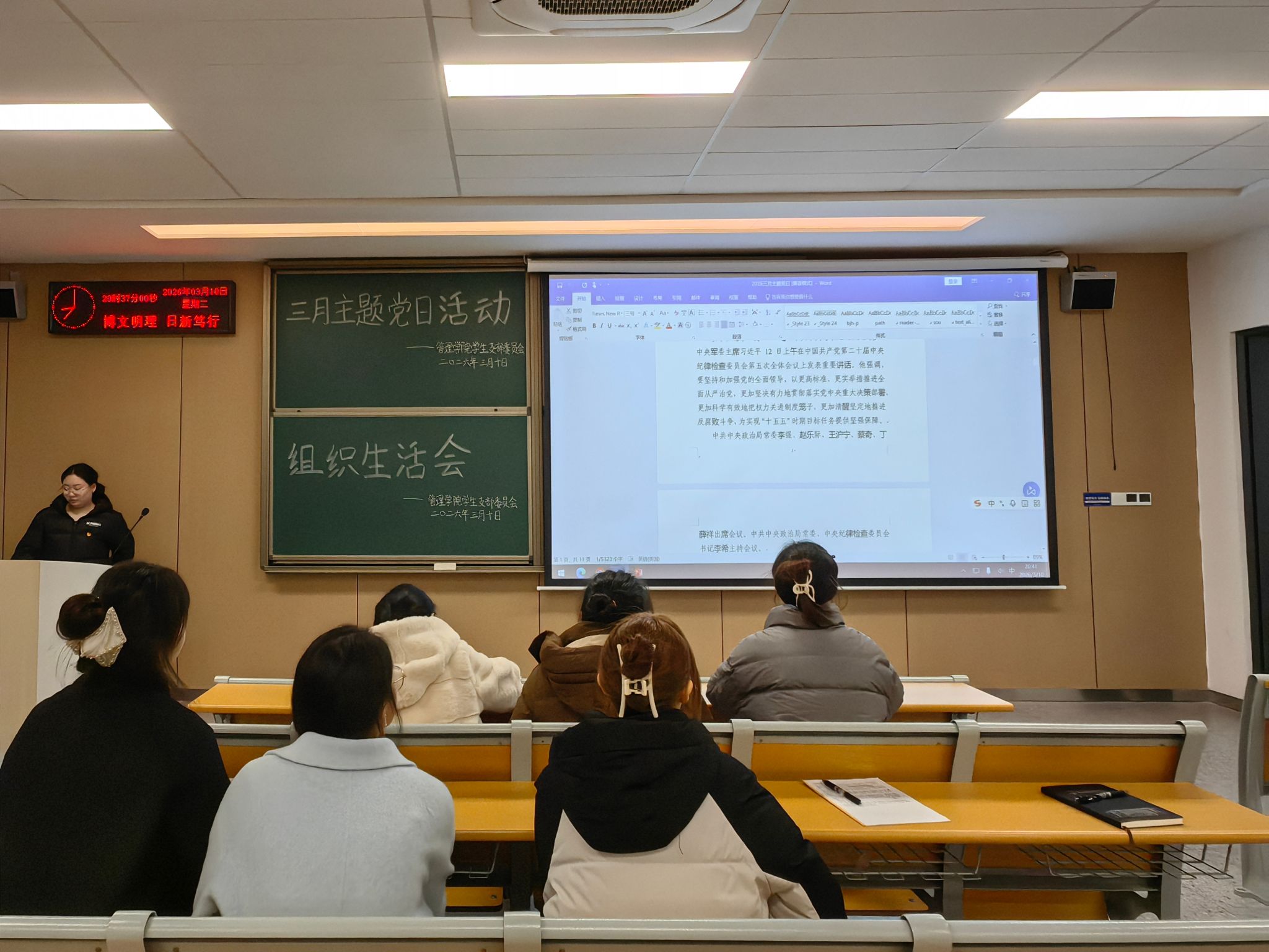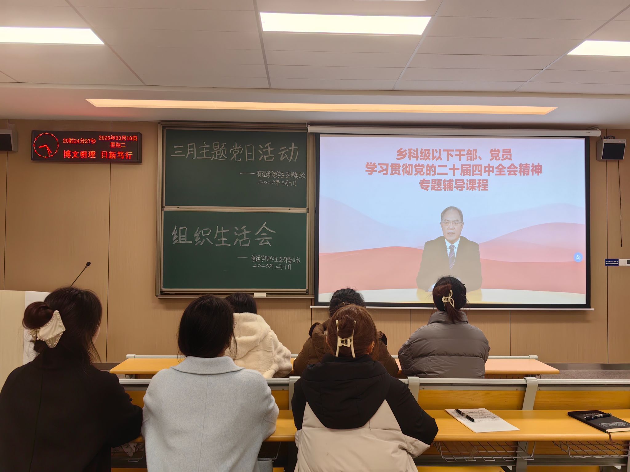 本网讯(通讯员 黄江琴)3月10日,管理学院学生党支部在教学楼A-402召开三月主题党日活动,支部全体党员参加。本次活动以“扎实开展树立和践行正确政绩观学习教育”为主题,旨在引导党员同志深刻领会习近平总书记关于树立和践行正确政绩观的重要论述,深入学习贯彻党中央最新精神,切实将正确政绩观内化于心、外化于行。会议由汪李雨涵同志主持。