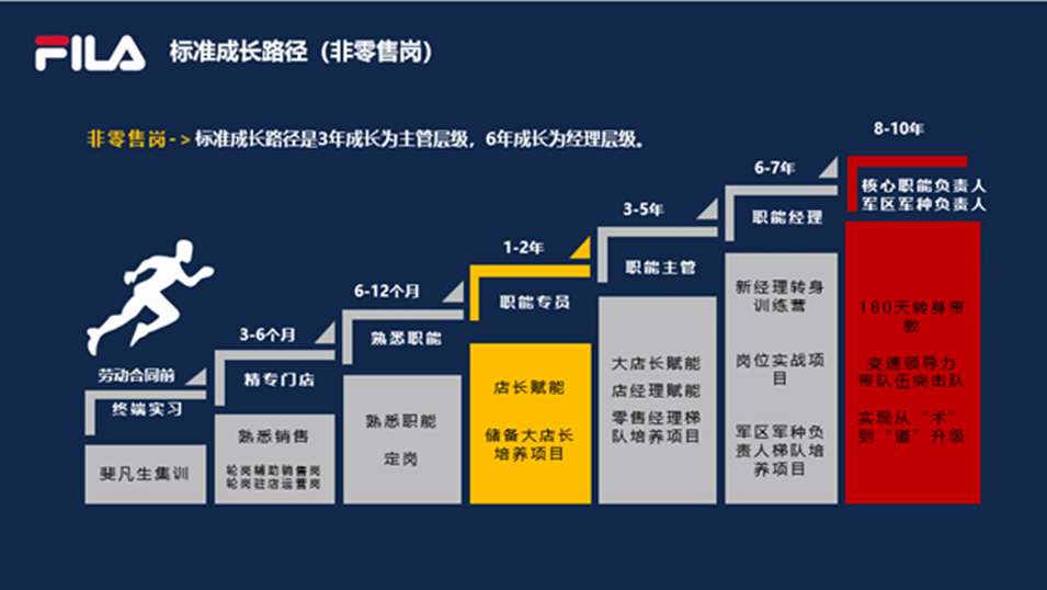 在经历零售终端实践,商品/陈列/培训/营销等岗位轮岗后,积累和掌握管理区域及提高生意的能力,将成长为军区军种(办事处/事业部负责人)及核心职能的高管储备梯队: