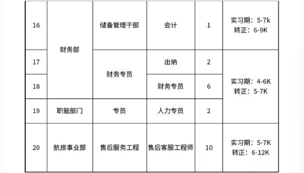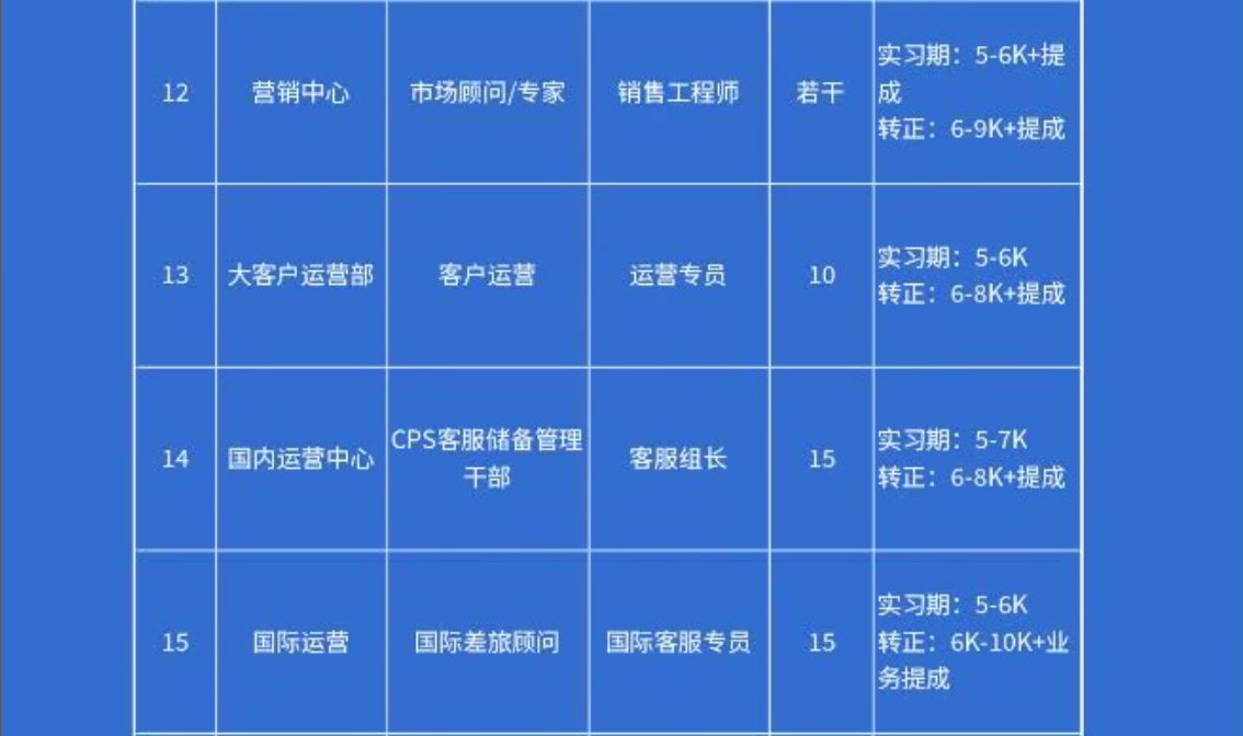技术支持类:实习期:5-6K;转正:6-8K销售运营类:实习期:5-6K;转正:7-12K
