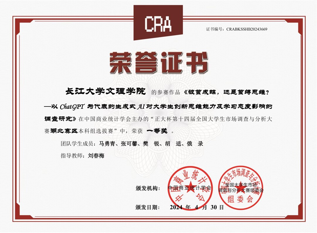 刘春梅老师积极带领学生参加全国各项赛事,并多次在国家级赛事中荣获奖项。2019年至2025年,连续7年指导学生在全国大学生市场调查与分析大赛中,荣获湖北赛区一等奖或二等奖。2022、2023、2024年指导学生获湖北省“挑战杯”大学生课外学术科技作品竞赛分别获省二、三等奖;在市场调查比赛指导的过程中,无论是调查方案的设计,还是数据分析的操作,都在学生身边给予科学的指导;为了给学生更好的现场表现,她带领学生跑去缝纫店为学生量身定制衣服,只为给学生更好的表现和展示。针对红色赛道精准扶贫项目和创业计划实践项目,她经常开着车带着学生跑商家,跟客户交流。联合大学生“三下乡”,带领学生深入农村展开调研,指导学生如何与农户交流,访谈,如何整理文件资料,撰写创业计划书,在挑战杯创业计划大赛中,带领学生深入企业和基层进行实地调研,让学生受益匪浅。在比赛指导过程中,她经常日夜陪伴学生,为学生指导答疑,用陪伴和行动给学生克服困难的勇气和力量。