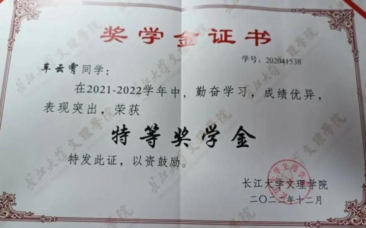 2022年12月,获学院特等奖学金,获“三好学生”称号
