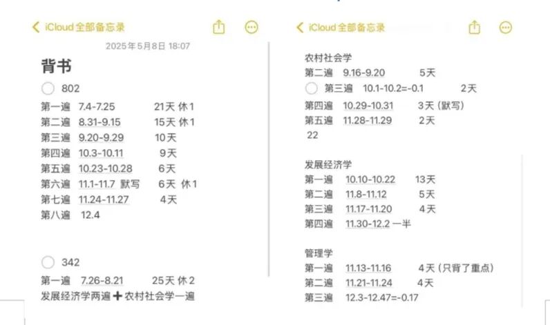 七月,我正式开始专业课复习。农业管理专业有四本教材及中央一号文件,我首先是大致看了一边教材,了解大概难度。由于各书在考试中的占比不同,每本书所花的时间也有差异。个人计划在考试前完成五到六轮背诵,因此暑假两个月内需完成四本书的第一遍背诵。而每本书约 10 - 14 章,为落实计划,我需要每天背诵一章的全新内容。每背完一本书后就立刻开启下一本,直至四本全部背完,紧接着开始第二轮。以此类推,不断重复。