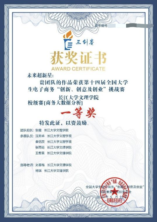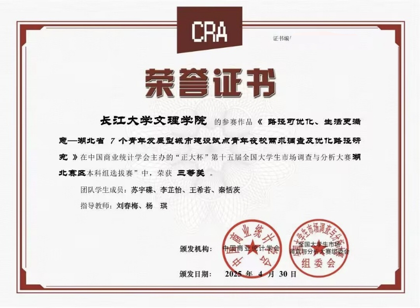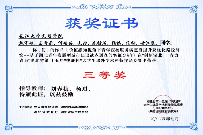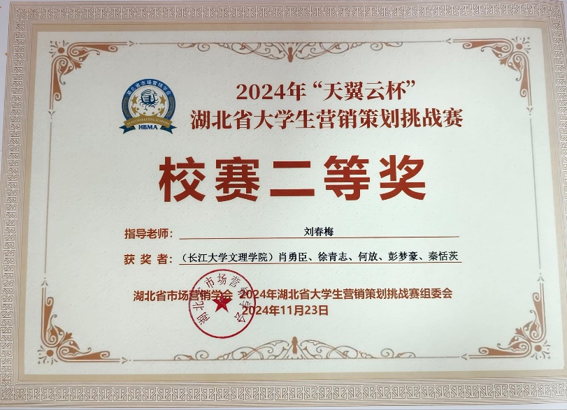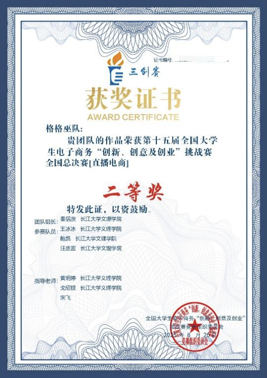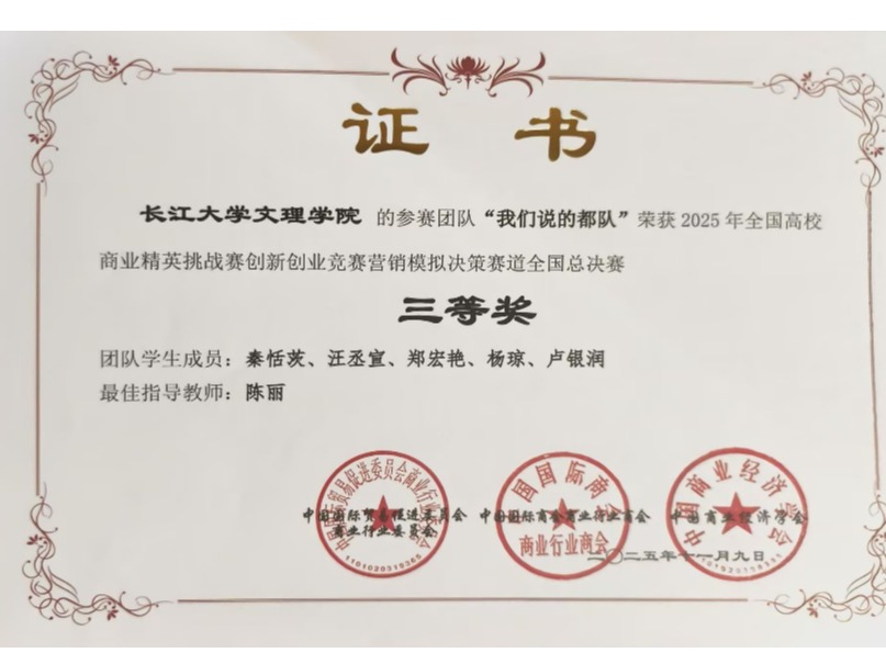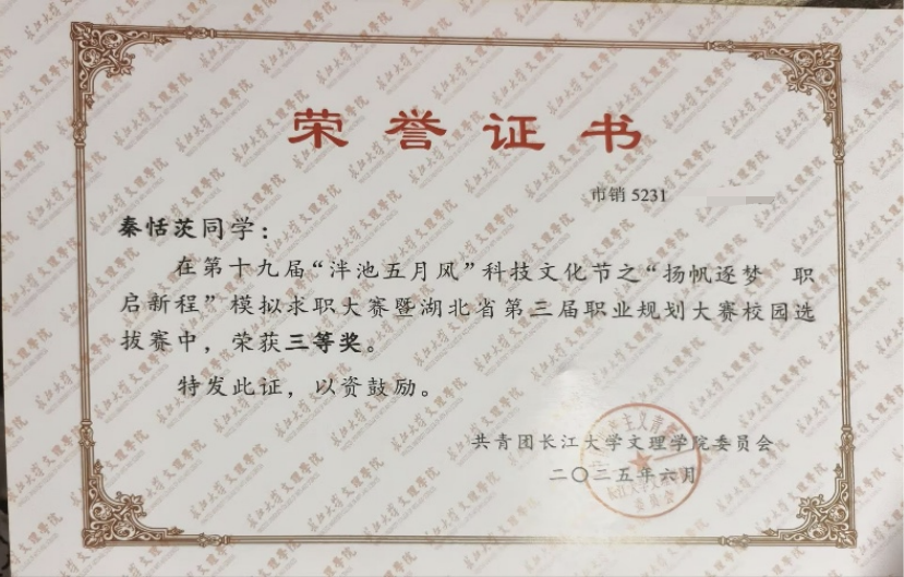 自入学以来,秦恬茨积极参与各类专业竞赛,在多项比赛中表现突出。她曾荣获第十五届全国大学生电子商务“创新、创意及创业”挑战赛直播赛道全国二等奖、第十五届湖北省“正大杯”大学生创业营销大赛三等奖、第十五届湖北省“挑战杯”大学生课外学术科技作品竞赛三等奖。