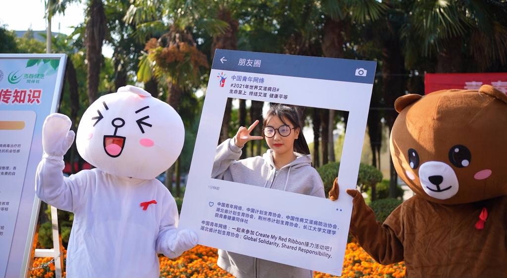 校园内,志愿者们通过发放宣传册、免费避孕套、写寄语、知识问答、朋友圈合影等方式开展宣传活动,青春健康同伴社社员现场跳起《生命之舞》,号召大家珍爱生命,预防艾滋。同时在校园各个角落,志愿者们戴好红丝带,拍摄防艾宣传视频,拍摄的防艾视频用于校园内外防艾宣传倡导。