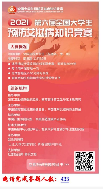 本网讯(通讯员 张建)“生命至上 终结艾滋 健康平等”2021年12月1日是第34个“世界艾滋病日”,我院青春健康同伴社于11月30日申请成为第六届全国大学生预防艾滋病病知识竞赛承办单位,比赛吸引累计超过400人参与答题。