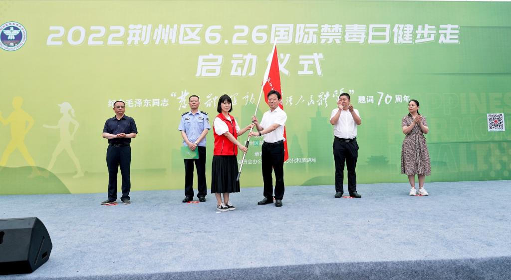 麒麟步、断毒路、齐出手、毒败走。禁毒宣传不仅要在理论中,要营造无毒健康氛围,宣传工作也要从运动中开展。6月24日上午,在“全民禁毒,健康生活”2022年荆州区“6.26”国际禁毒日健步走活动中,荆州区委常委、常务副区长周远栋向yl7703永利集团志愿者服务队授旗。