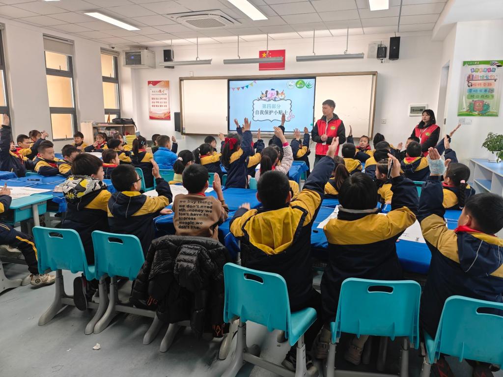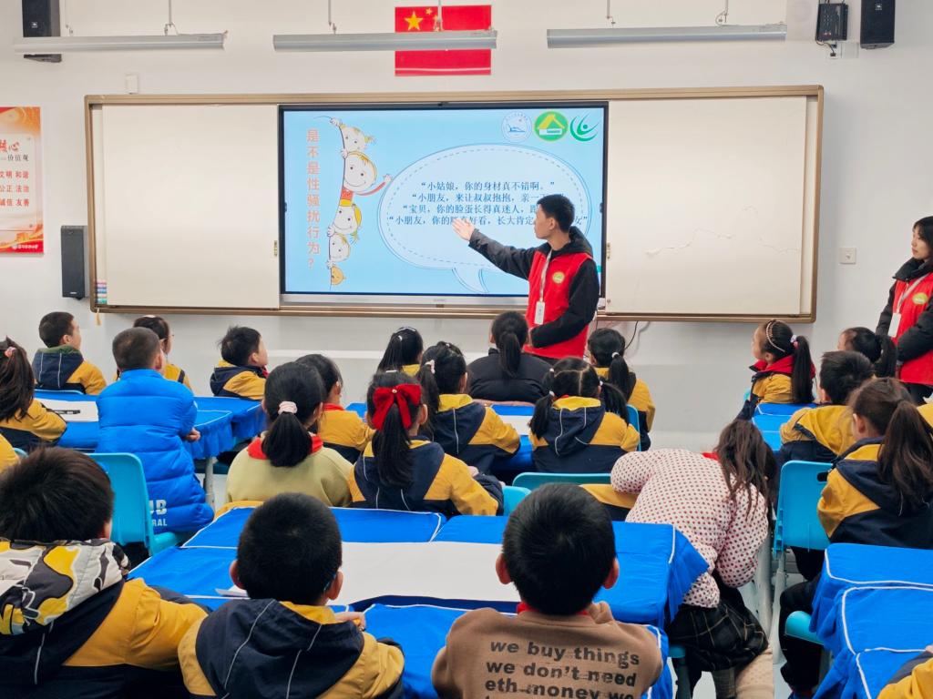 在这次活动中,荆州实验小学的学生被分批带入体育馆,体验VR眼镜,社员们为小朋友们介绍VR眼镜是什么,怎么用,为他们答疑解惑。同时,部分社员进入教室,开展讲座,讲座的开场由主持人胡子涛带着荆州实验小学的小朋友们进行暖场小游戏,带动小朋友们的情绪,活跃气氛,暖场小游戏结束后,就开始了正式的讲座,为小朋友们讲解了什么是性骚扰,怎么应对性骚扰,如何保护自己等问题,在这过程中,小朋友们进行讨论,更深刻了解了性骚扰相关知识。